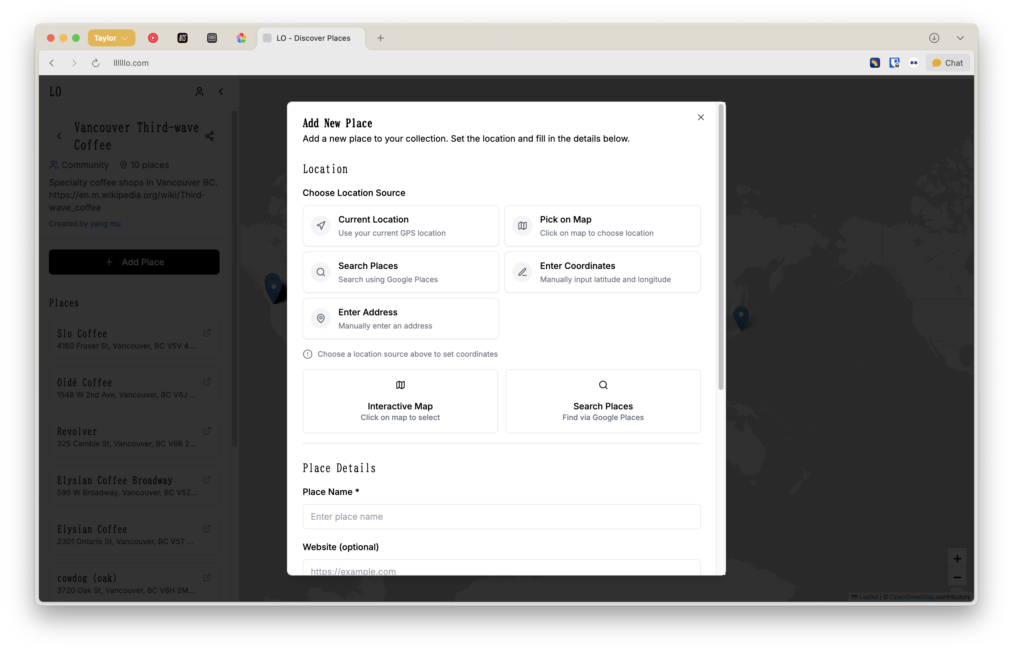 Using addresses, geotagged photos, or Google Places search, users can drop pins on a global map where every addition is visible. Unlike Google Maps, which begins with search, LO invites discovery—showing only places people have taken the time to add.